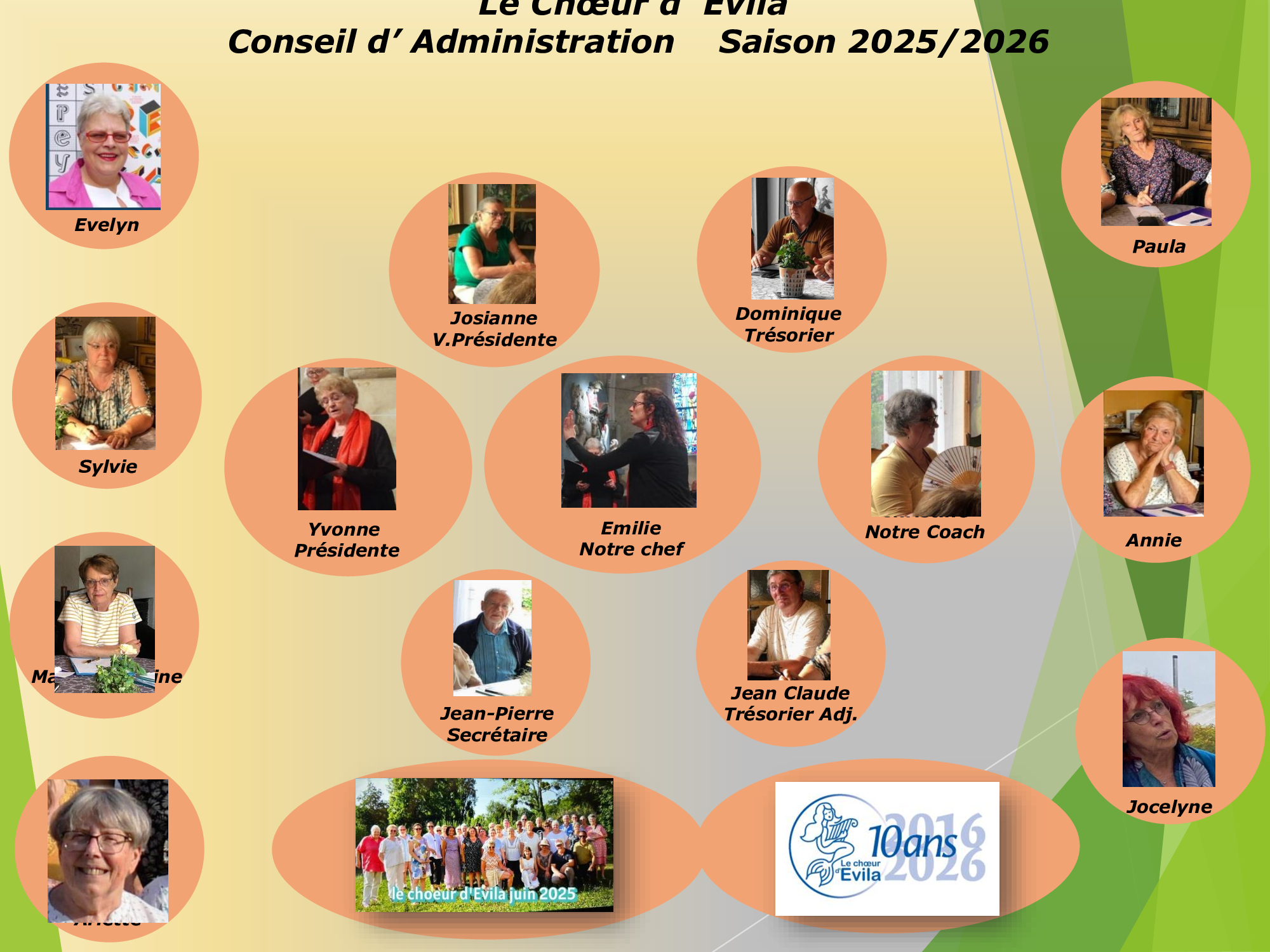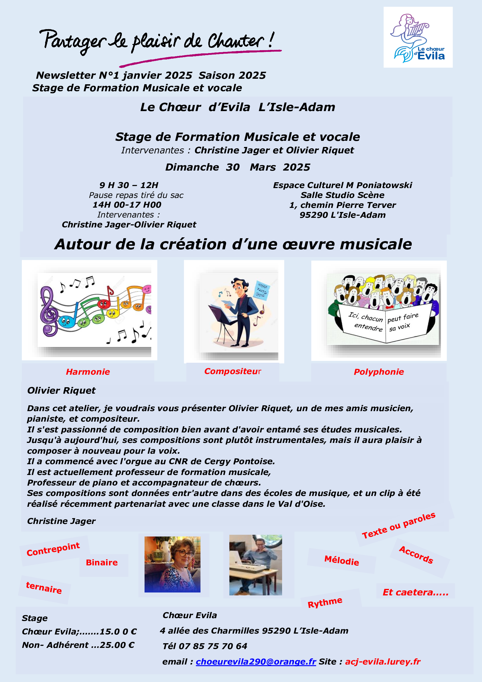 La chorale « LE CHŒUR D'EVILA » de l'Isle-Adam : Est une association loi 1901 créée en 2016. Est ouverte à toute personnes à partir de 16 ans , quelque soit sa nationalité, ses idées politiques, sa religion, désireuse de chanter et de s'investir en intégrant ce groupe. SIége Social de l'Association : Centre Culturel Michel Poniatowskl ,1 chemin Pierre Terner à L'Isle-Adam Siége Administratif: 4, allée des Charmilles - 95290 L'Isle-Adam Chef de choeur: Emlie Duchesne Coach vocal: Christine Jager Présidente; Yvonne Daviron - Tél: 06 13 19 75 41 Trésorier: Dominique Morel - Tél: Secrétaire: Jean-Pierre.Daivron - Tél: 07 85 75 70 64 Courriel Evila: Choeurevila290@orange.fr Site:acj.evila.lurey.fr Répétitions: Le lundi de 18 H 00 à 20 H 00 (Hors vacances scolaires) Centre Culturel Michel Poniatowskl ,1 chemin Pierre Terner à L'Isle-Adam Studio Scéne Cotisation: 130,00 € par an |