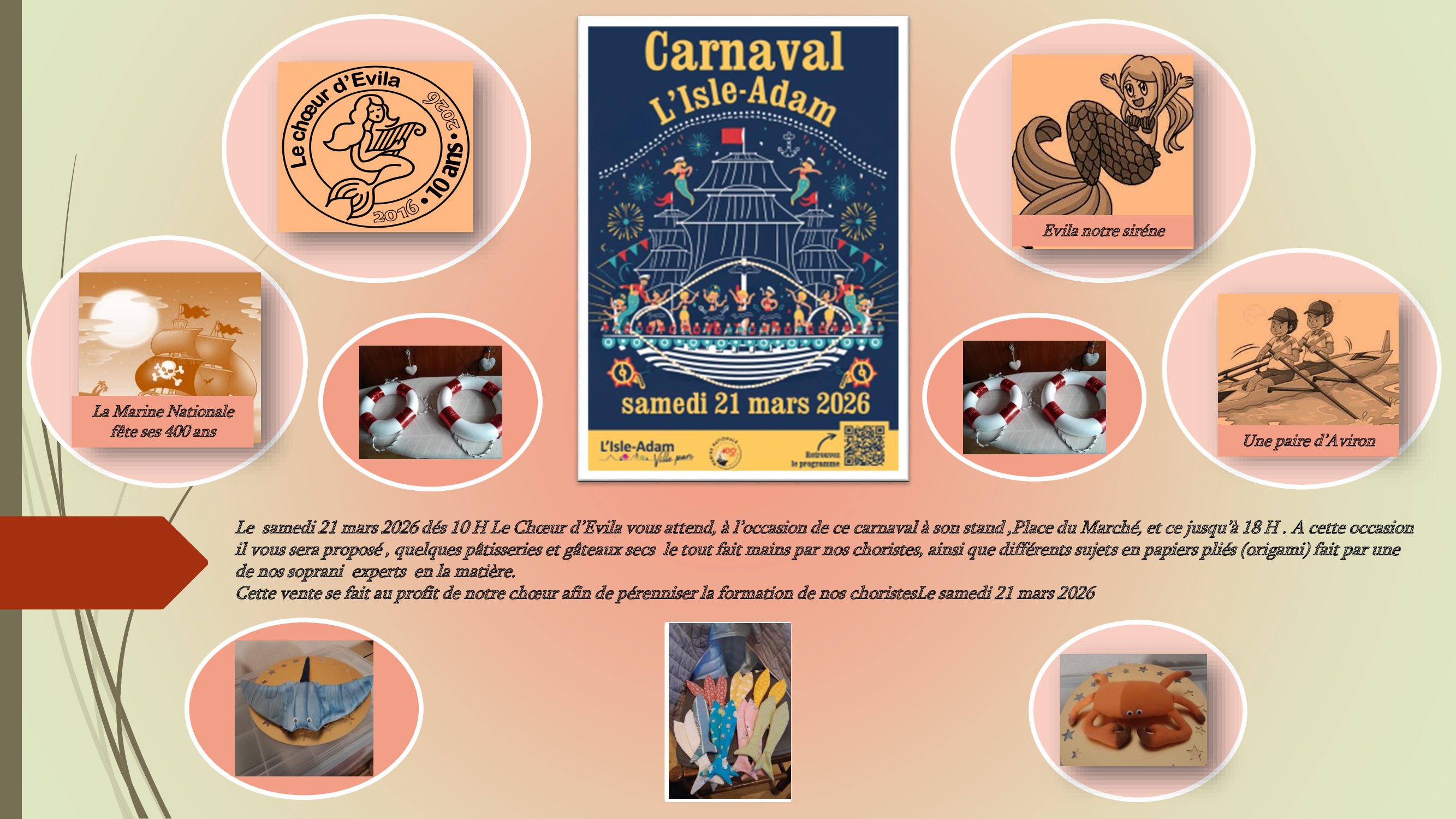Le Choeur d Evila Le choeur d'Evila » à L'Isle-Adam, dont le siège social et les lieux de répétition se trouvent au Centre Culturel Michel Poniatowskl ,1 chemin Pierre Terner à L'Isle-Adam ,a été créé en 2016 Nous avons comme objectifs de développer et promouvoir la pratique du chant choral, et favoriser les activités de formation vocale et musicale à l'intérieur du groupe, de renforcer les liens sociaux entre adhérents par le plaisir de chanter ensemble L'Association se propose de produire animations et concerts à L'Isle-Adam et dans le Val d'Oise et de participer aux activités associatives de notre ville telles que le Forum des associations, le Carnaval Adamois .